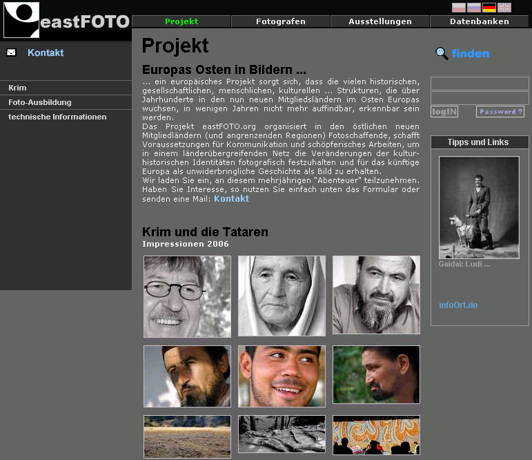 Das Projekt eastFOTO.org organisiert in den östlichen neuen Mitgliedländern (und angrenzenden Regionen) Fotoschaffende, schafft Voraussetzungen für Kommunikation und schöpferisches Arbeiten, um in einem länderübergreifenden Netz die Veränderungen der kultur-historischen Identitäten fotografisch festzuhalten und für das künftige Europa als unwiederbringliche Geschichte als Bild zu erhalten.